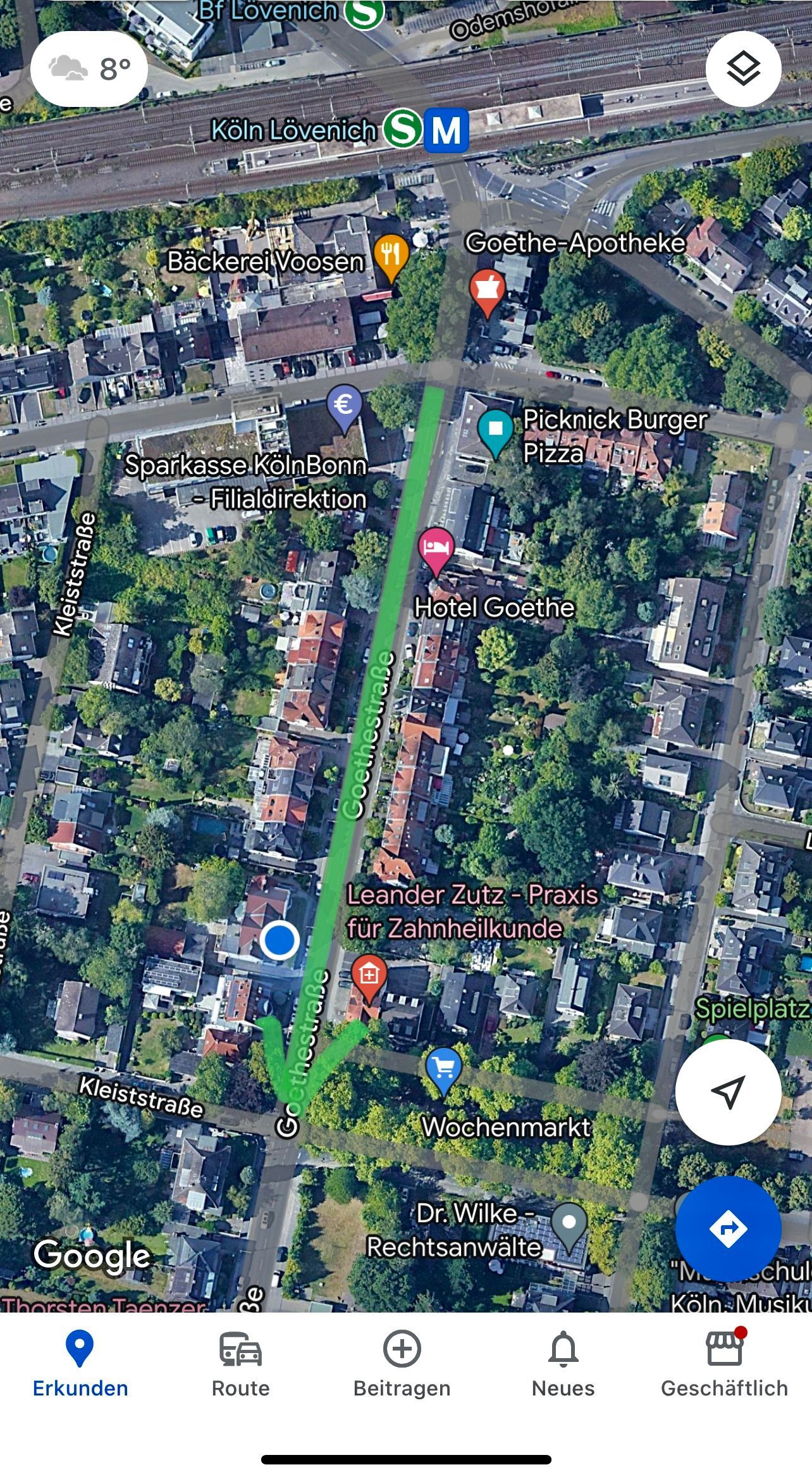 - Beispielsweise auf dem rechten Parkstreifen der Goethestraße in Richtung Weiden-Zentrum ab dem S-Bahnhof Lövenich bis zur Ecke Kleiststraße.